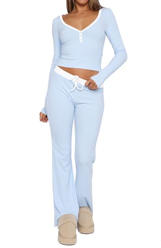LACOZY Sweat Suits for Women V Neck PJ Set Pajama Set Slim Fit Workout Matching Set Light Blue S