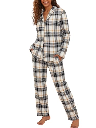 Famulily Women Long Sleeve Pajamas Sets Plaid Lounge Nightwear 2pcs Pj Sets Matching Set Beige XXL