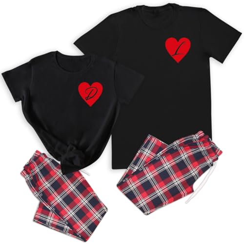 The Gift Project Personalised Initial & Heart - Couples Matching Pyjamas - Top & Tartan PJ Bottoms - (Sold Separately) Black