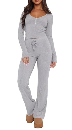 LACOZY Sweat Suits for Women 2 Piece Long Sleeve V Neck Pj Set Ribbed Pajama Set Slim Fit Workout Matching Set Grey S