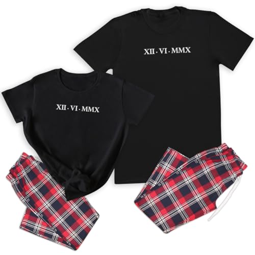 The Gift Project PERSONALISED Roman Numerals Date - Couples Matching Pyjamas - Top & Tartan PJ Bottoms - (Sold Separately) Black