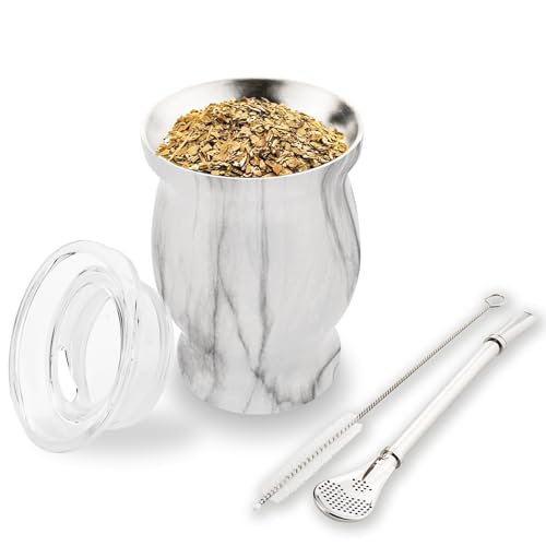 Binsakao Yerba Mate Gourd Cup Set, Stainless Steel Double-Walled Yerba Mate Tea Cup with Lid & Cleaning Brush, 8.4 oz (White)