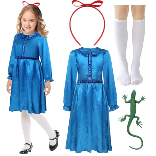 Formemory 4Pcs Matilda Costume Kids,World Book Day Costumes for Gilrs with Blue Dress, Hairband, Socks and Lizard Prop for Book Character Dress Up and School Events