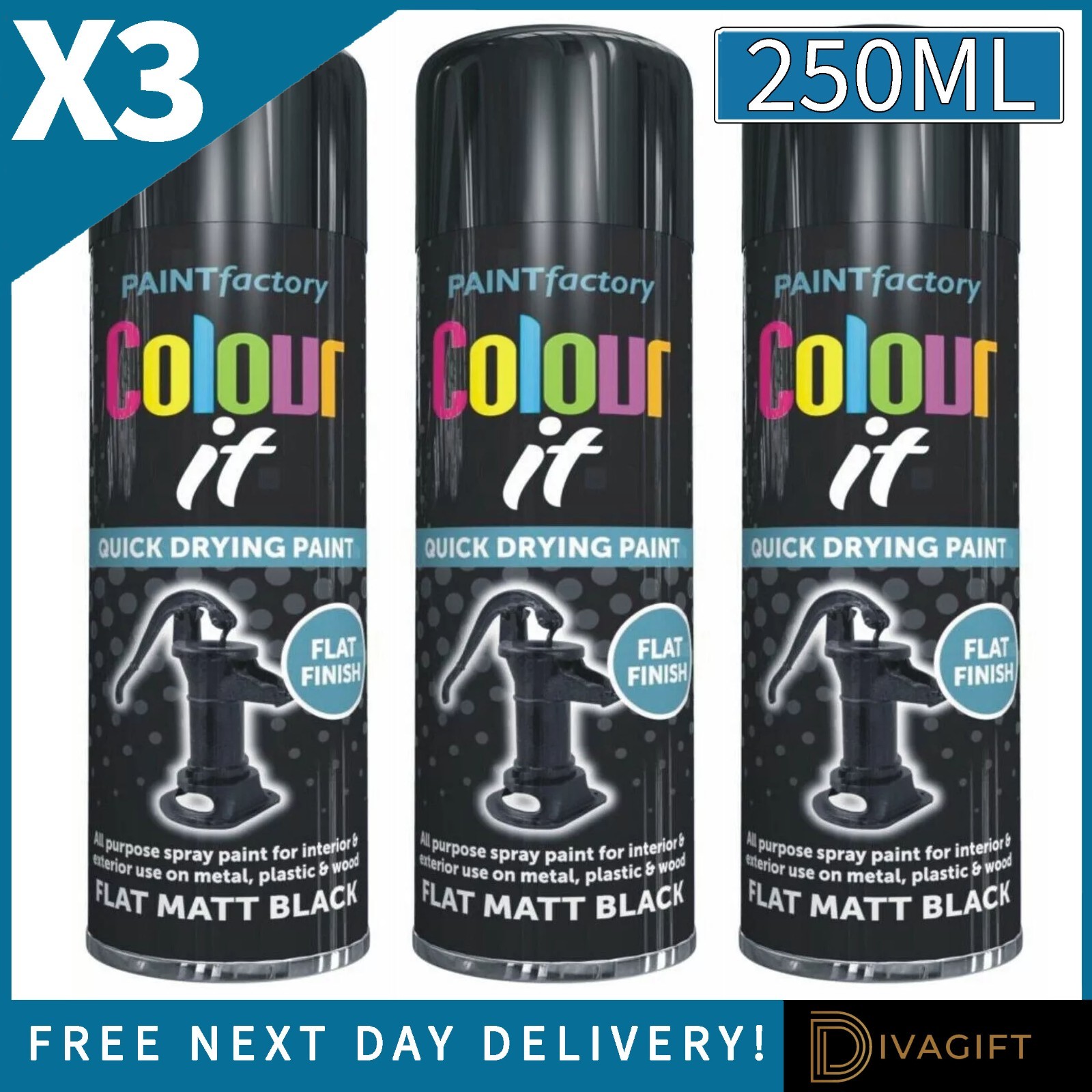3 x FLAT MATT BLACK FINISH SPRAY PAINT 250ML AEROSOL FOR METAL PLASTIC WOOD NEW