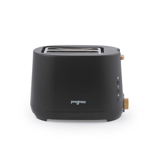 Progress Skara 2-Slice Toaster - Defrost, Reheat, Cancel Functions, 6 Browning Levels, Removable Crumb Tray, Bagels, Crumpets, Sourdough, Blue LED Illumination, Matt Black & Wooden Accents, 750W
