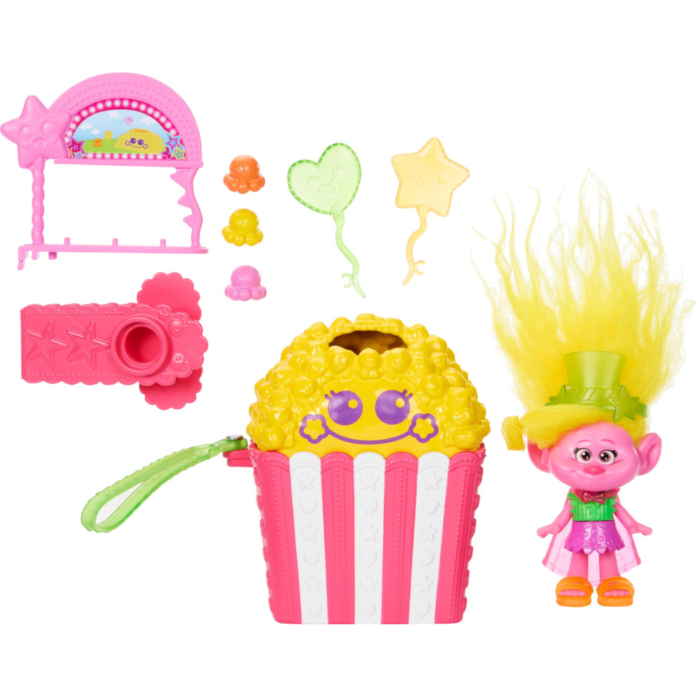 Mattel DreamWorks Trolls Fun Fair Surprise FairFest Small Doll & 10 Accessories, Carnival Food Popcorn Theme with Queen Poppy