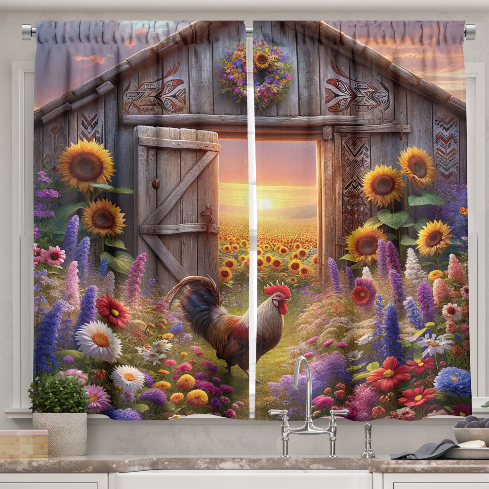 Ambesonne Rustic Kitchen Curtains, Colorful Flowers and Rooster, 55"x24", Mauve Taupe and Multicolor
