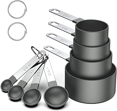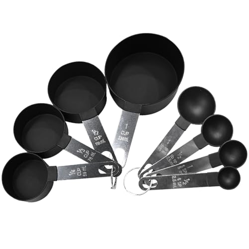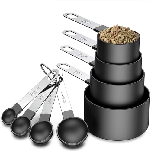8 Piece Measuring Cups and Spoon Set Stackable Stainless Steel Handle for Measuring Dry and Liquid Ingredients for Kitchen (Black)