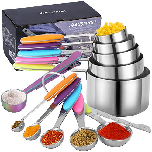 HAUSPROFI Measuring Cups and Spoons Set of 14, Stainless Steel Cup Measurement Set with Measuring Scoop and Clip for Food, Soft Silicone Handle and Ruler, for Baking, Kitchen Cooking, Liquid and Solid
