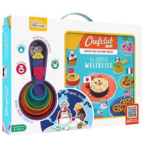 Chefclub Kids - “The Great Journey of the World” Cookbook Set with Measuring Cups, Atlases and Stickers, Cooking Art for Kids, German Version