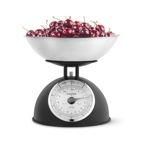 Salter Timeless Mechanical Kitchen Scale – Cooking Scale, 2L Dishwasher Safe Bowl, Easy-Read Dials, Large Digits, No Batteries, Retro Design, 5kg Capacity, Weigh Ingredients, Classic Look, Black