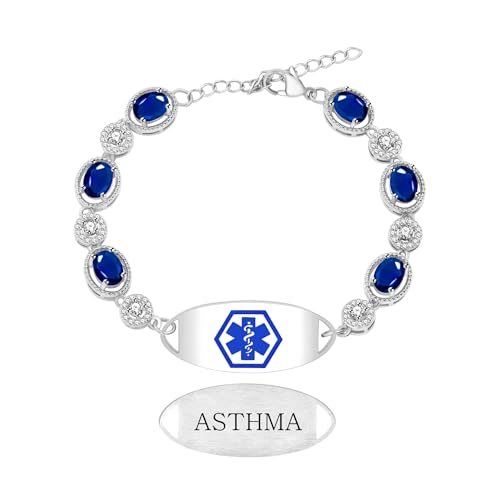 Platinum Plated Medical Alert ID Bracelet – Oval Cut Blue & White Zircon Emergency Safety Jewelry for Women – YA5732
