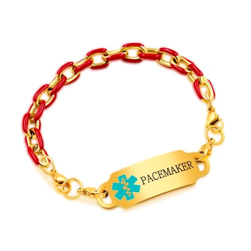 Medical Information Bracelet for Women Men - Gold Plated Stainless Steel Design with Red Enamel Paperclip Chain Medical Alert Bracelets YA5207