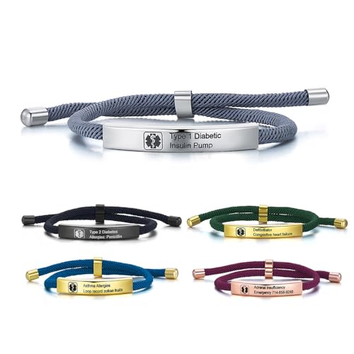 Personalised Medical Alert Bracelet for Women Men, Custom Text Star of Life ID Identification Emergency Medical Alert Adjustable Rope Bracelet, Stainless Steel Epilepsy Bracelets