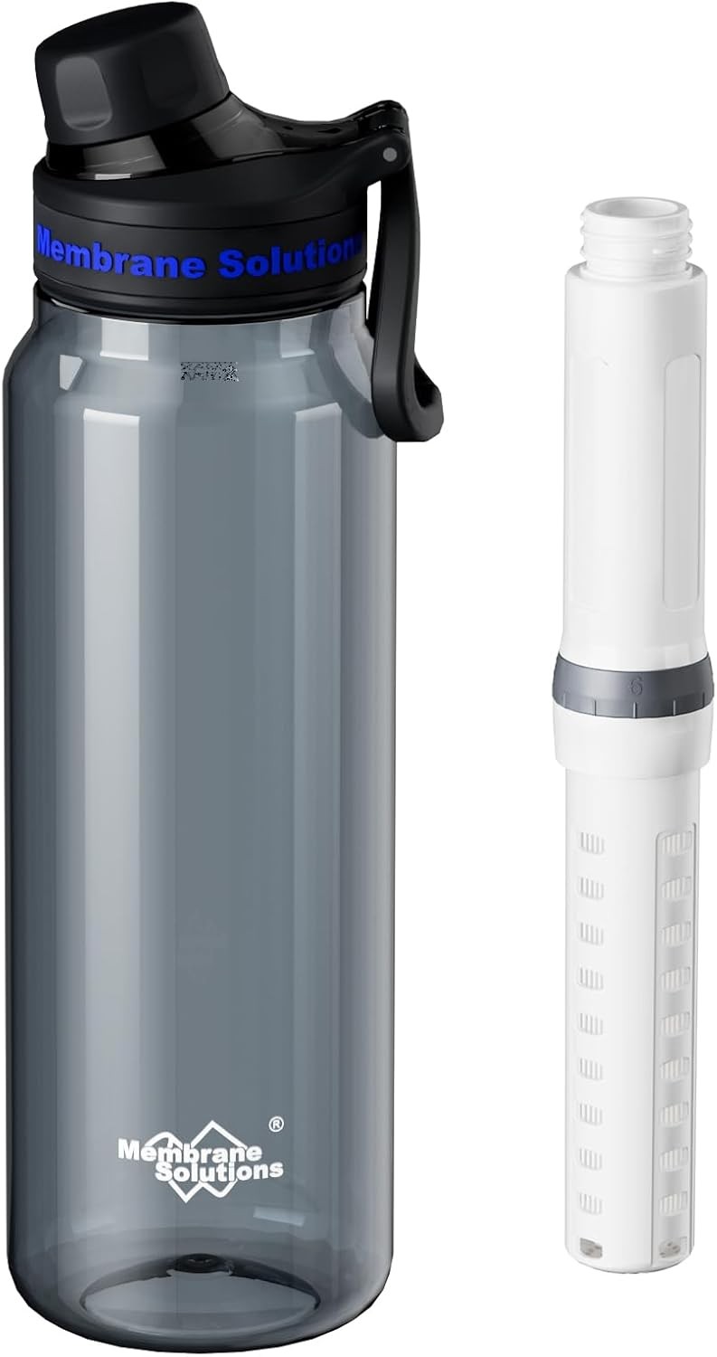 Membrane Solutions Outdoor Water Filter Bottle 1L (36oz) with ACF + UF Filter Cartridge, Tritan, 0.1 ?m Filtration, Removes 99.9999% E. coli,
