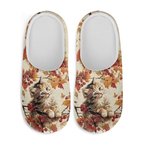 Jndtueit Women's Cute Cat Fall Maple Leaves Cozy Slippers Fuzzy Hotel Home Memory Foam Shoes for Women Men Washable House Slipper with Wide Widths for Indoor
