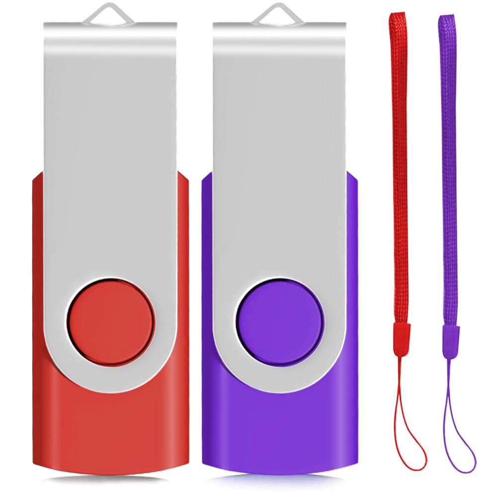 Memory Stick 64GB 2 PACK USB Stick 2.0 Pen Drive Swivel Design Photo Memory Sticks Fold Storage (Red/Purple With Lanyard)