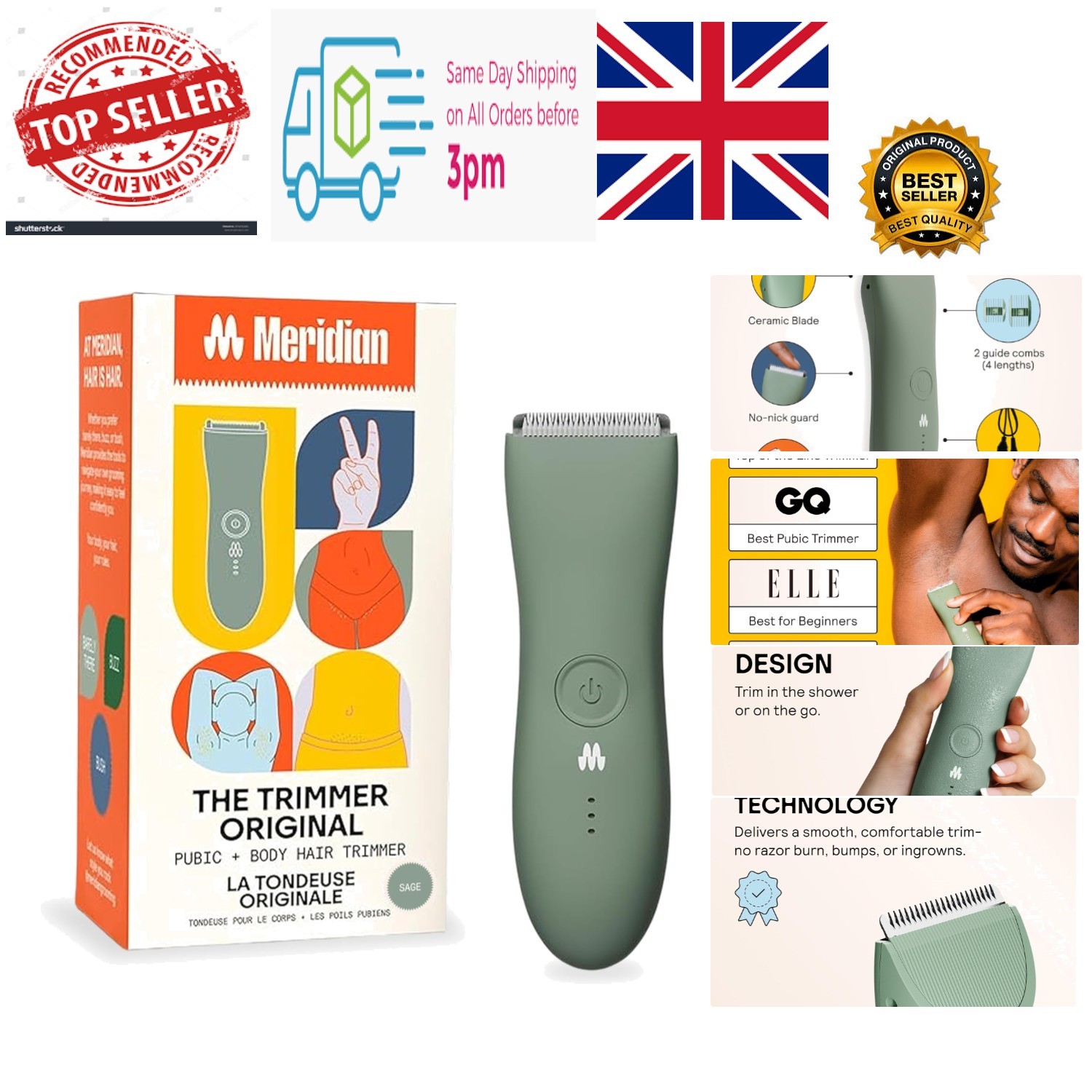 Meridian The Trimmer Original, Body Hair Trimmer for Men, Electric Shaver for Pubic Hair, Chest, Legs & Bikini, Waterproof & Rechargeable, Sage