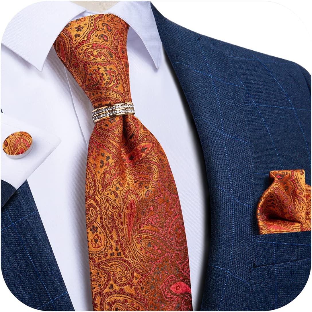 DiBanGu Silk Ties for Men and Gold Tie Ring Woven Pocket Square Cufflinks with