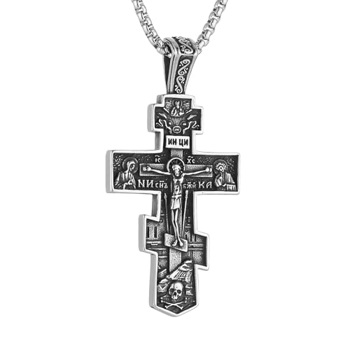 HZMAN Orthodox Cross Necklace for Men Stainless Steel Vintage Crucifix Cross Pendant Necklace Jewelry Gift (Silver)