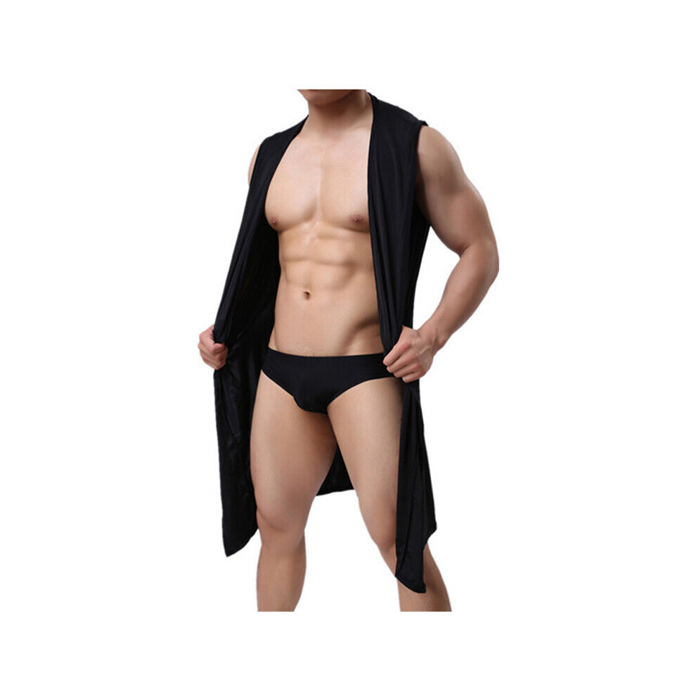 Men's Bathrobes Sleeveless Hooded Robes Men Sexy Pajamas Sleepwear Icy Silky Lingerie Erotic Robe Sets Bath Robe no Briefs