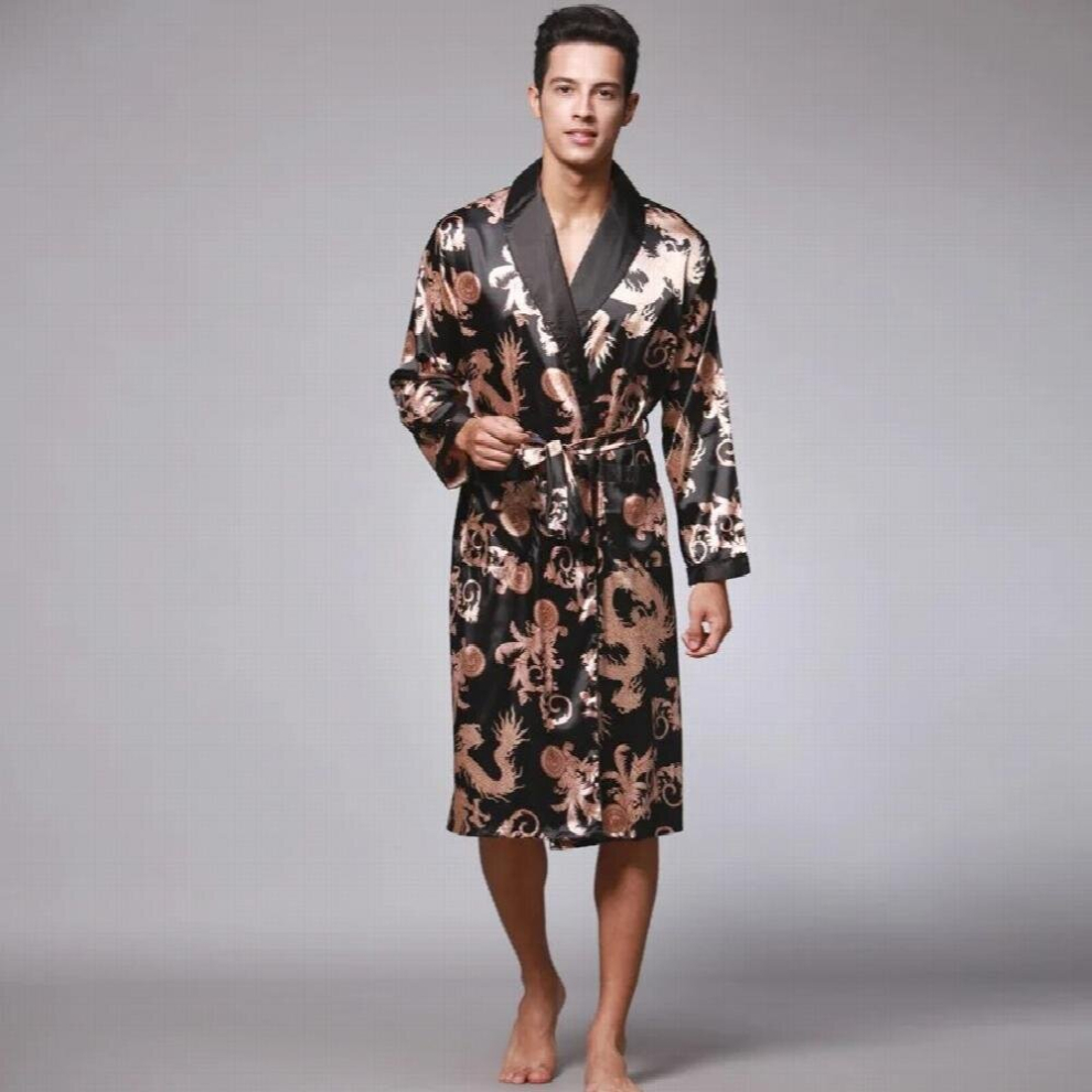 Oversize Bath Robe Men Long Sleeve Mens Bathrobe Imitate Silk Nightgown Sleep Tops Kimono Men Home Bath Gown Male Printed Robes