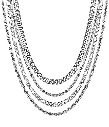 YADOCA 4PCS Silver Chains for Men Stainless Steel Necklace for Men Women Boys Cuban Rope Figaro Box Chain Mens Necklace
