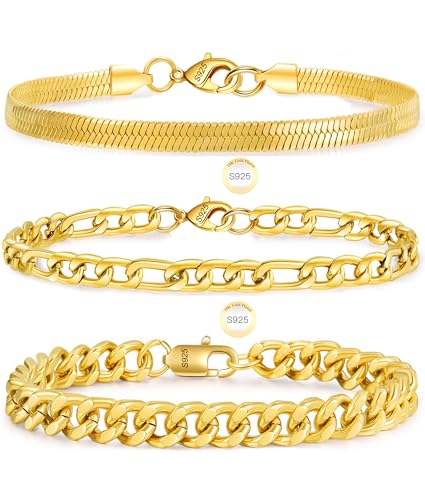 Rajputana Gold Chain Bracelets for Men Boys, S925 Sterling Silver Wrist Band Cuban Figaro Chains Metal Link Bracelet Set Stack Mens Accessories Jewelry Gifts Him Male Oro Pulsera Para Hombres 9 inch