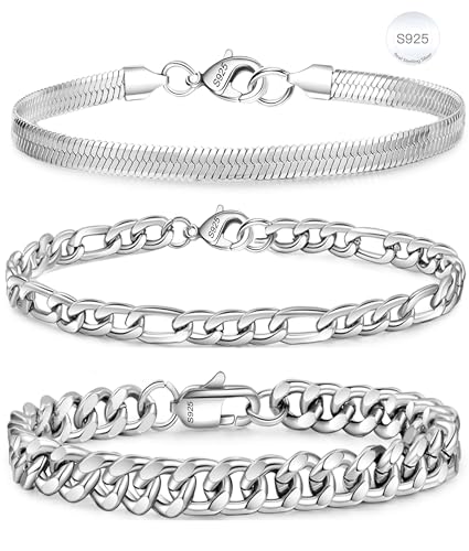 Rajputana Sterling Silver Chain Bracelets for Men Boys, S925 Wrist Band Cuban Figaro Chains Metal Link Bracelet Set Stack Mens Accessories Jewelry Gifts Him Male Pulsera Para Hombres 8.3 inch