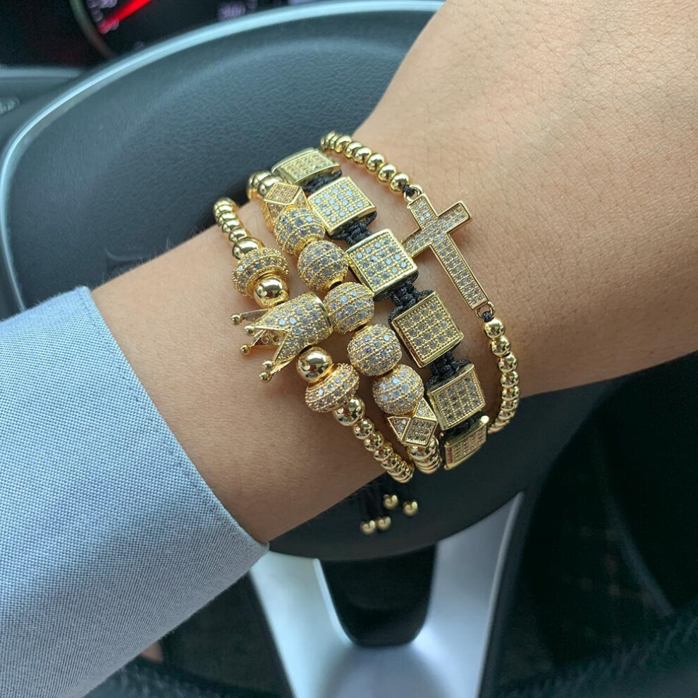 4pcs/set CZ crown cross Charm mens bracelet stacks copper beads Macrame bracelets & bangles for mens accessories