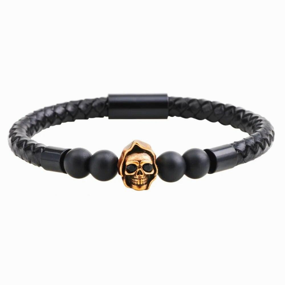 RSAMD 2Pcs/set Fashion Punk 4mm Onyx Matte Copper Beads Skull Men's Couple Bracelets-Silver