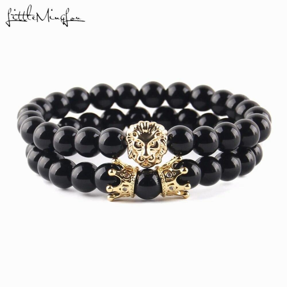 2pcs/set Bracelet Stack Copper Lion Head CZ Crown Natural Stone Beads Bracelets For Mens Jewelry Elasticity Bracelets Pulseiras