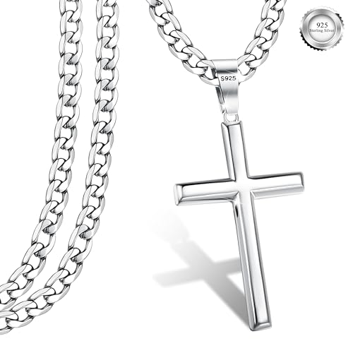 YADOCA 925 Sterling Silver Cross Pendant Necklace for Men Women with 5mm Stainless Steel Diamond-Cut Cuban Chain Mens Cross Necklace Crucifix Necklace (with Gift Box) 56cm