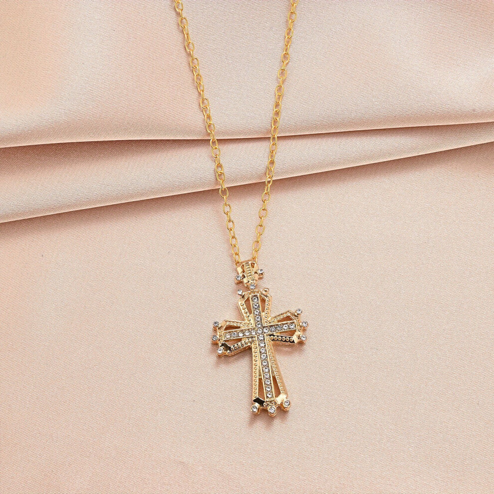 1pc Mens Cross Pendant Necklace Titanium Steel Golden Plated Carved Cross Necklace With Rhinestones Long Pendant Sweater Chain Accessories Thanksgivi