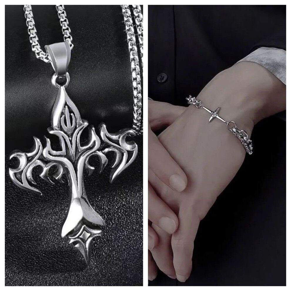 2 Pcs Mens Necklace Bracelet Set Mens Cross Star Necklace Bracelet Pendant Gift For Men Couples Or Women