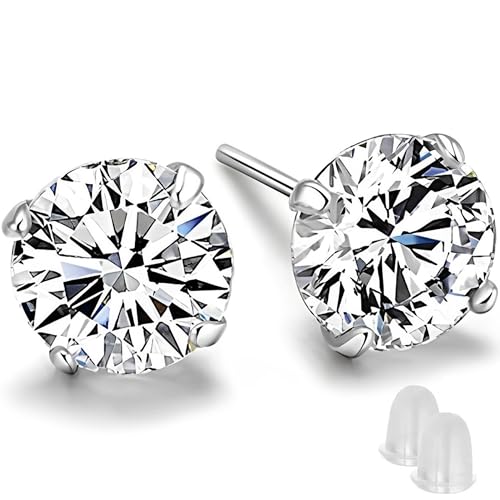 SQAQS Silver Stud Earrings, 1 Pairs 925 Sterling Silver Stud Earrings for Women 6mm Hypoallergenic Men Earrings Cubic Zirconia Sleep Cartilage Studs Gifts for Mens Women, White