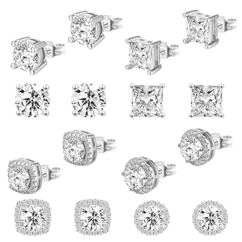 Dochais 12 Pairs Mens Earrings, Silver Earring for Men Women, CZ Round & Square Ear Studs, Cubic Zirconia Earrings Studs Set, Men's Earring Hypoallergenic for Women Size: 3/4/5/6/7/8mm
