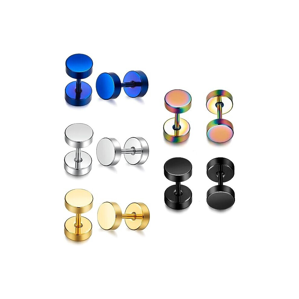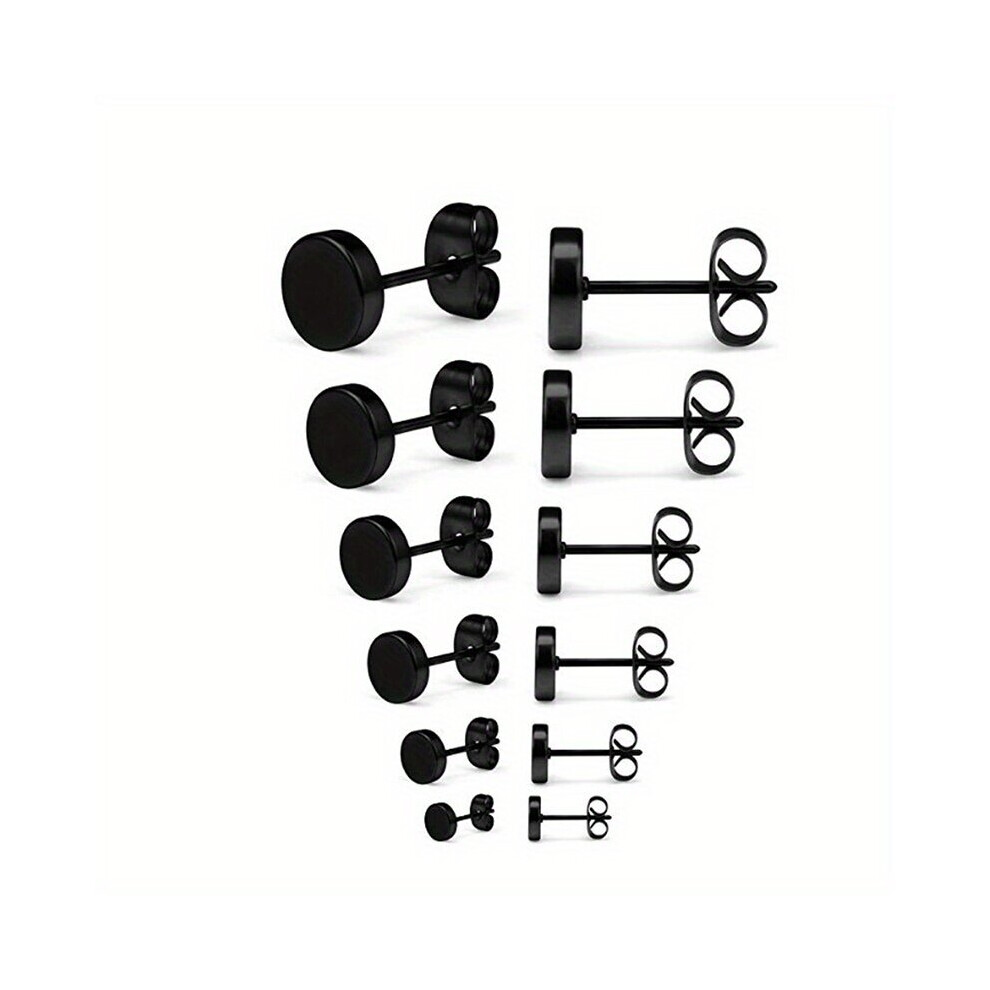 LOCCY 12 Pairs Mens Studs Earrings, Stainless Steel Men Earring Round Stud Earrings Screw Flat Back Earring Fake Tunnel Plug Piercing for Mens Women Boys Girls, 3-8mm (Black Silver Set-8mm)