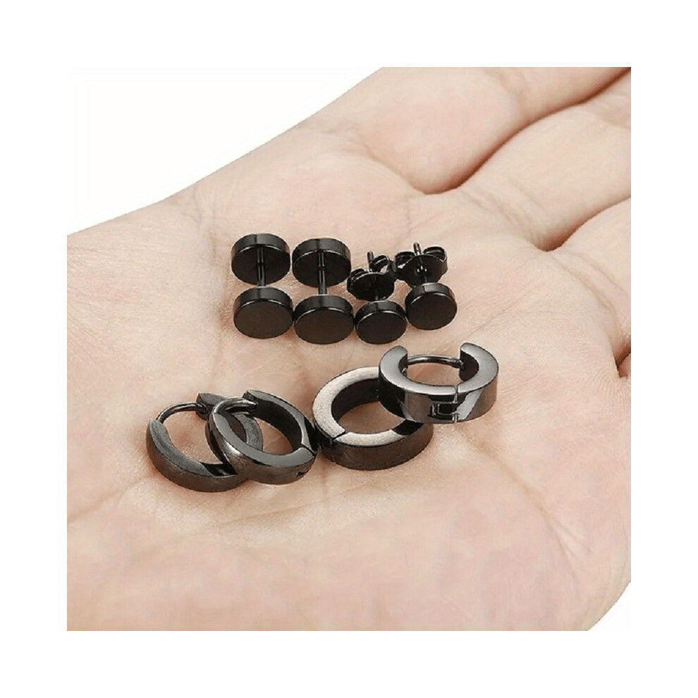 12 Pairs Men's Stainless Steel Earrings - Studs, Barbell, Ear Hoops for Men & Boys in Black