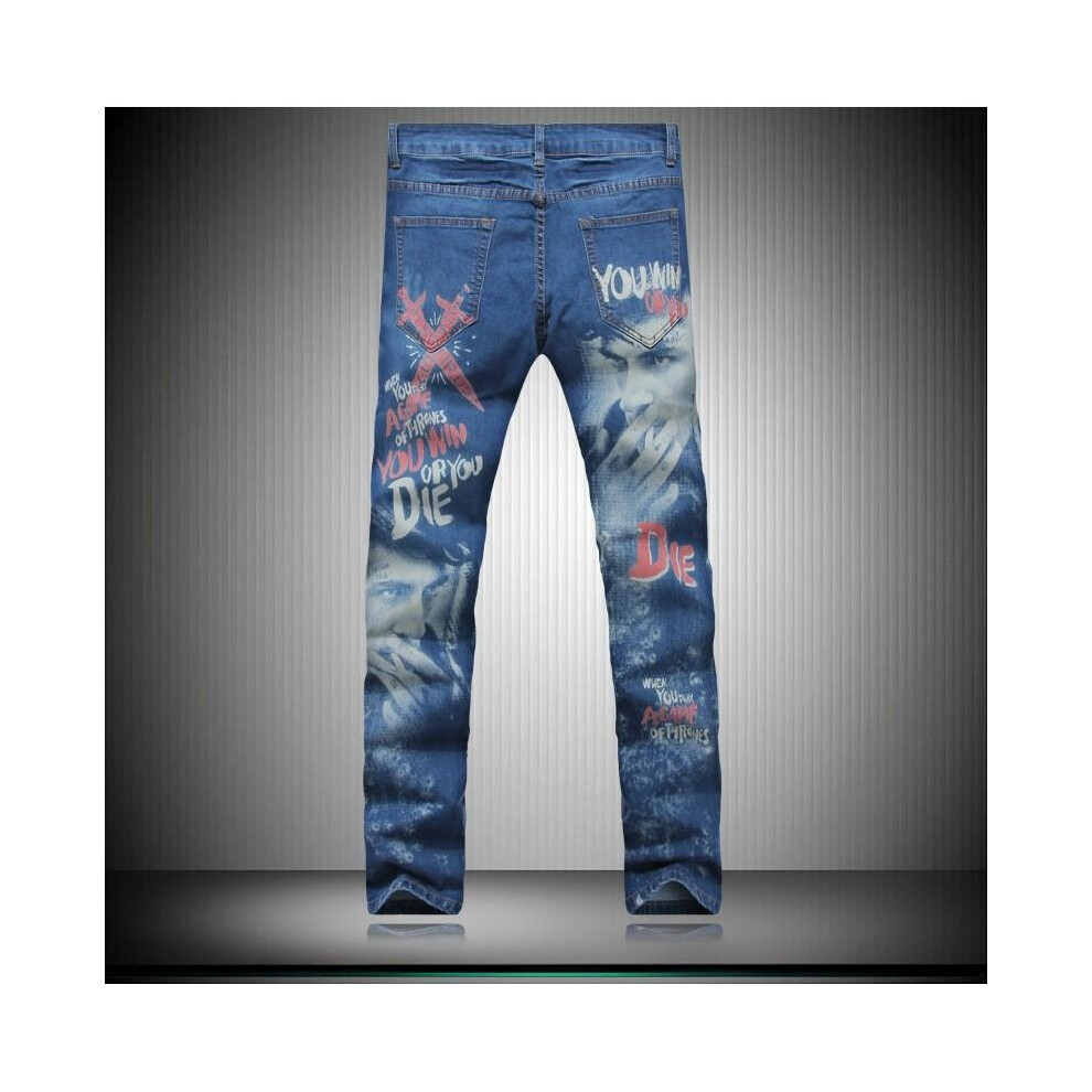 Men's fashion print jeans Male swords smoke man colored drawing slim denim pants Blue trousers