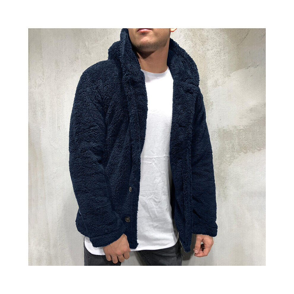 (Navy Blue, L) Mens Teddy Bear Fluffy Fur Fleece Hoody Cardigan Hoodie Winter Warm Coat Jacket
