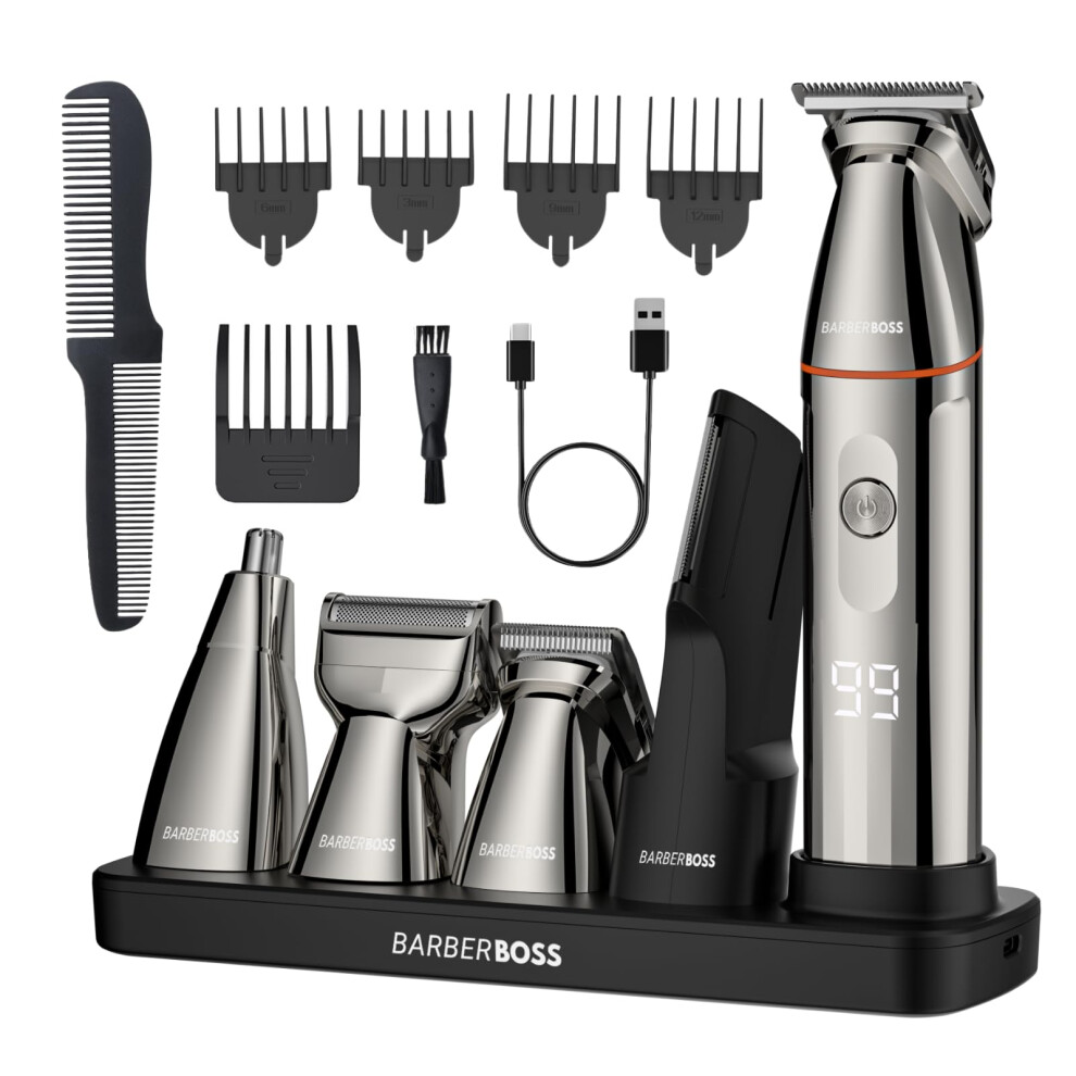 BarberBoss Men's Grooming Kit – Beard Trimmer Men, Hair Clippers Men, Nose Trimmer, Detail Trimmer, Waterproof, Rechargeable Grooming Set