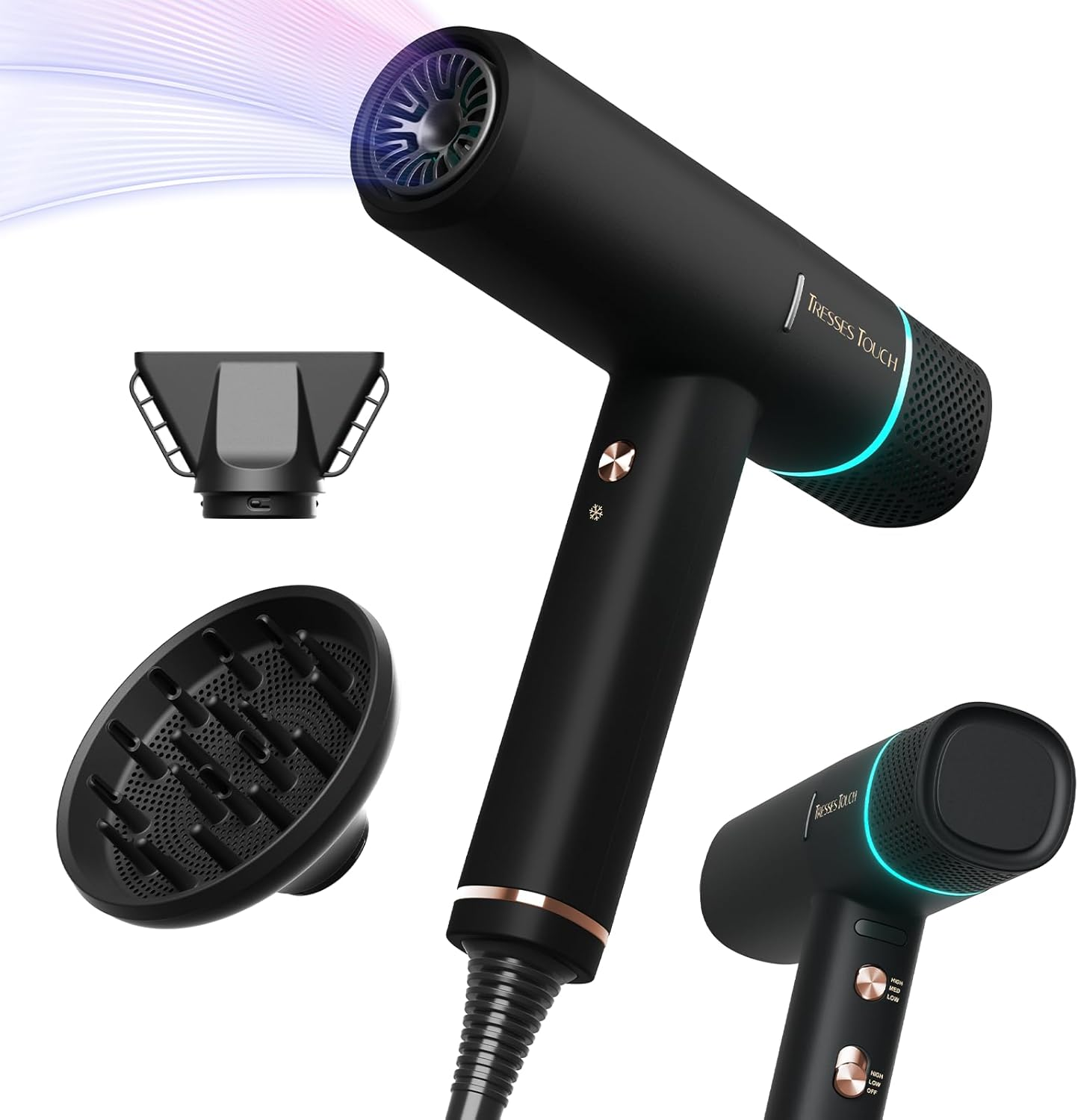 Faszin High Speed Hair Dryer, Lightweight Hairoryer with 110,000 RPM Motor, Fast Drying lonic Hair Dryer for Women & Men, Low Noise, 3 Magnetic Nozzles, Black(Matte Finish)