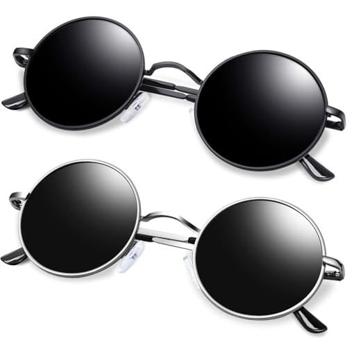 KANASTAL 2 Pack Black Round Sunglasses Mens Womens Polarized Small Circle Hippie Vintage Circular Driving Beach Hiking UV400 - Two Pairs Metal Frame Black Lens