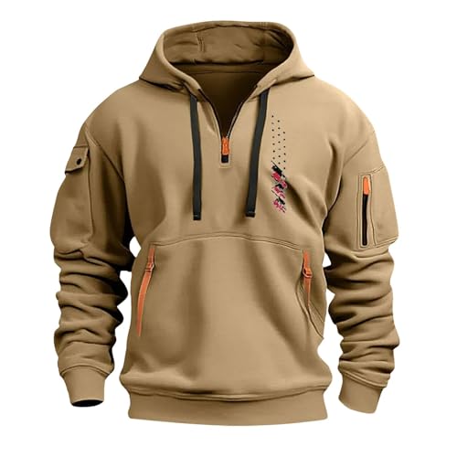 Mens Hoodies - Mens Hoodies Men's Autumn And Winter Half Zip Hoodie Sports Hoodie Comfortable Casual Loose Patchwork Solid Color Hooded Sweater Top (Khaki L)