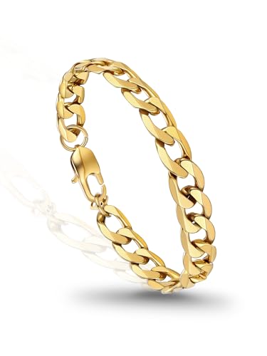 PROSTEEL Mens Bracelet - Stylish Flat Cuban Chain Wrist Link Bracelets Hypoallergenic 316L Stainless Steel Hip Hop Jewellery for Men Boys Gold Plated 21CM Length 9MM Width (with Gift Box)