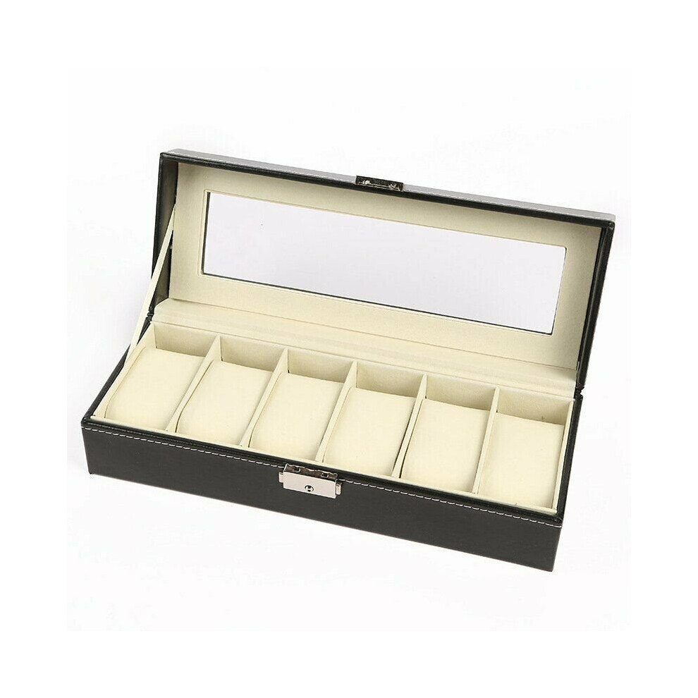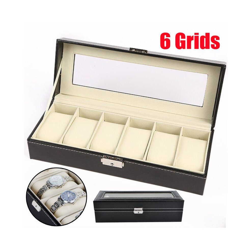 6 Grid Mens Watch Box Leather Display Glass Top Jewelry Case Storage