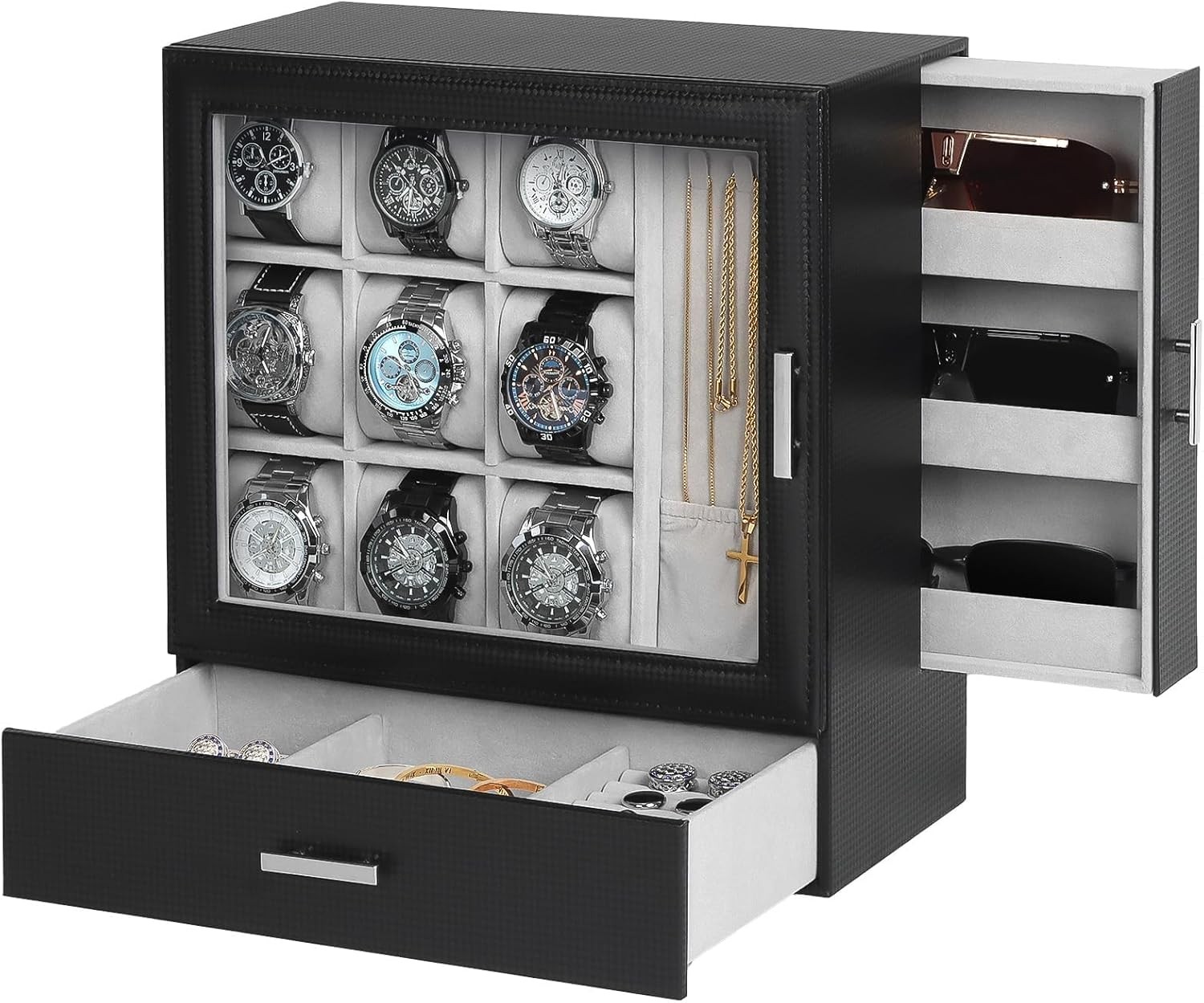 (As show, One size) Watch Box, Mens Jewelry Box with 6 Slot Watch Case & 3 Slot Sunglasses Organizer, 2 Layers Lockable Watch Holder