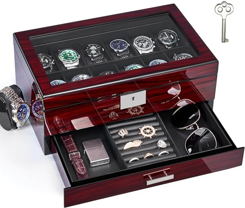 ANWBROAD Watch Box for Men with 12 Slots,2-Tier Wooden Watch Box with Drawer,Watch Case with Glass Lid,Key Lock,Storage Watch Display Case,Mens Jewellery Box Organiser,Red Wooden Piano Finish,JWB001Y