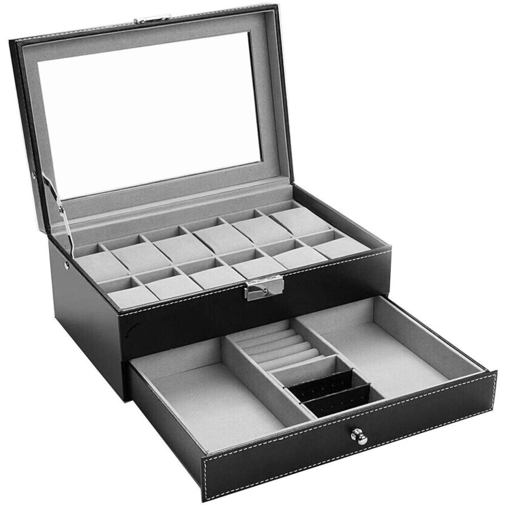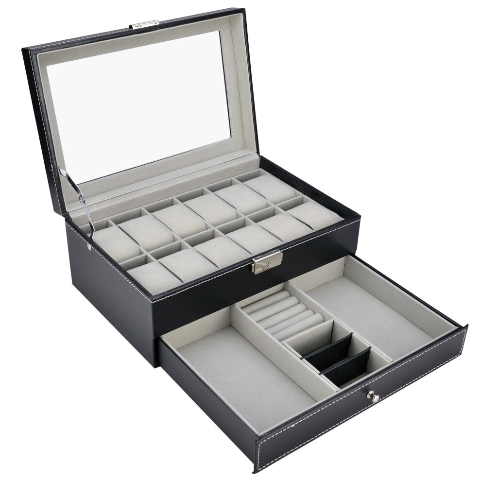 12 Grid Jewelry Watch Box Mens Jewelry Display Drawer Tray Glass PU